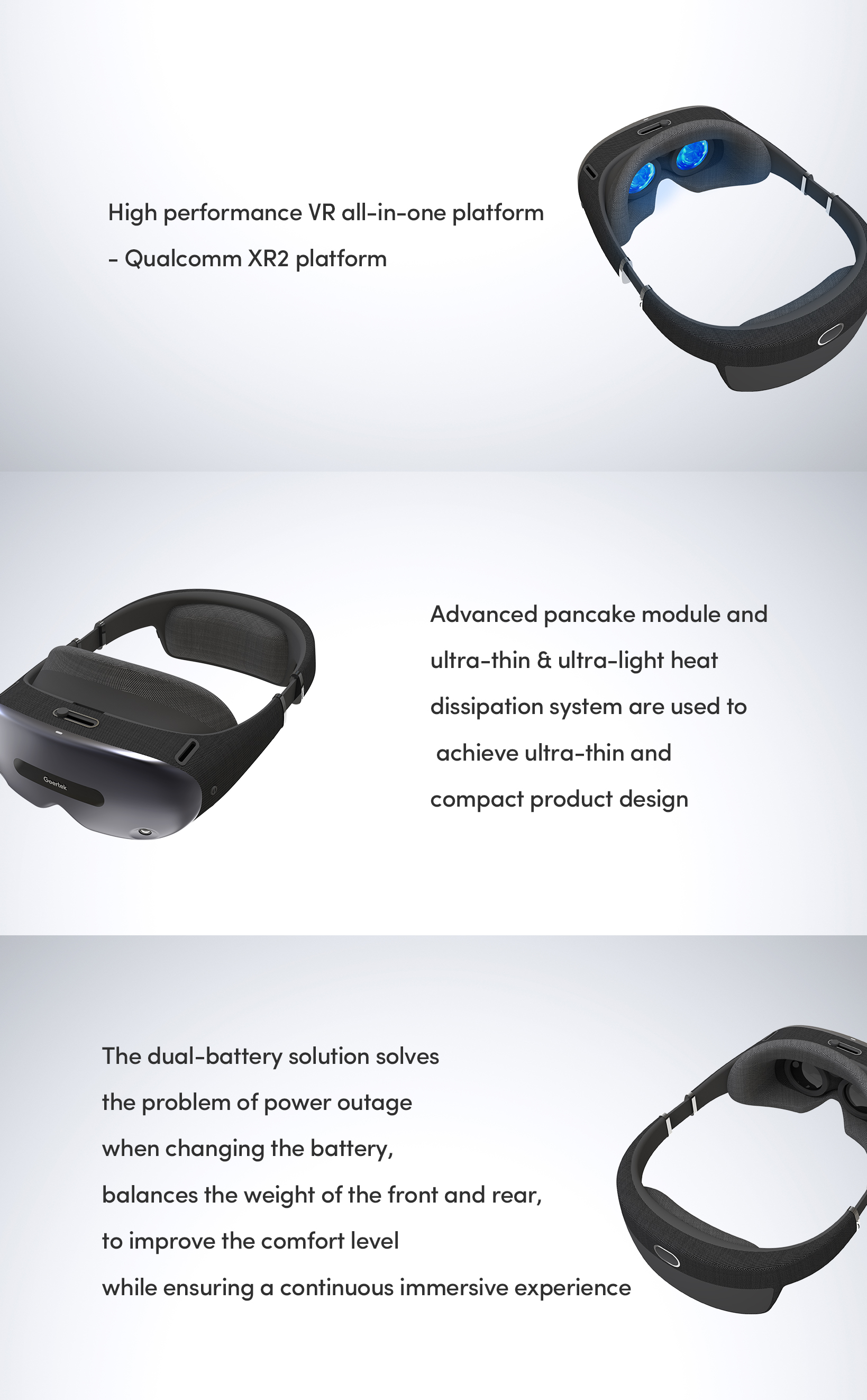 ■ The dual-battery solution solves the problem of power outage when changing the battery to improve the comfort level while ensuring a continuous immersive experience